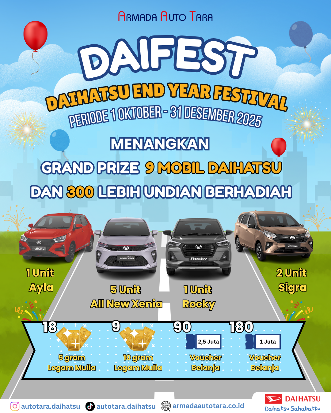 Kapan lagi beli mobil dapet hadiah mobil, yuk segera kunjungi dealer Daihatsu Armada Auto Tara terdekat, dan dapatkan juga hadiah menarik lainnya!