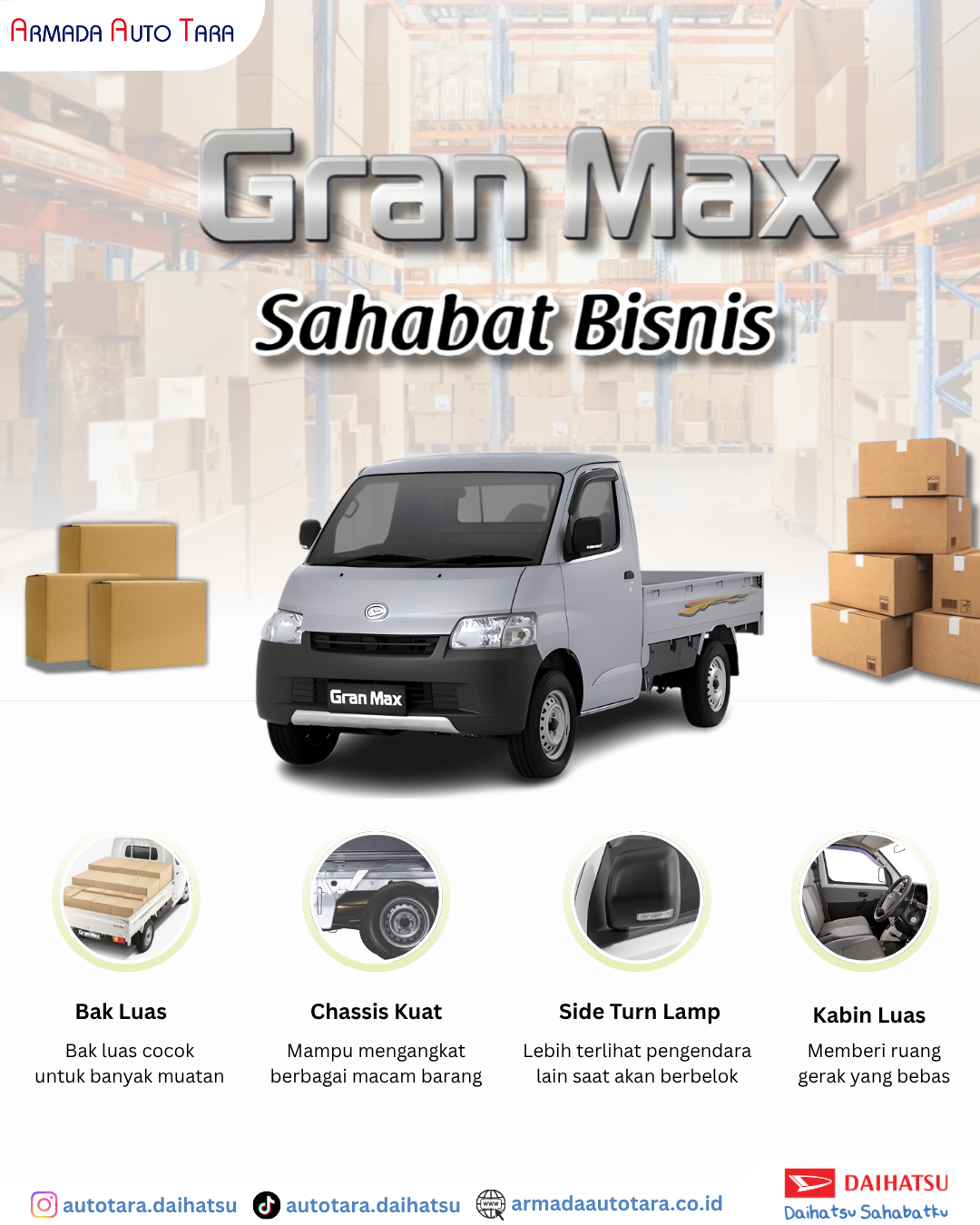 Dipercaya ribuan pelaku UMKM untuk angkut kebutuhan harian mereka, Siap naikin level bisnismu? Yuk konsultasi dan miliki unit Granmax mu sekarang! hanya di Auto Tara Daihatsu.